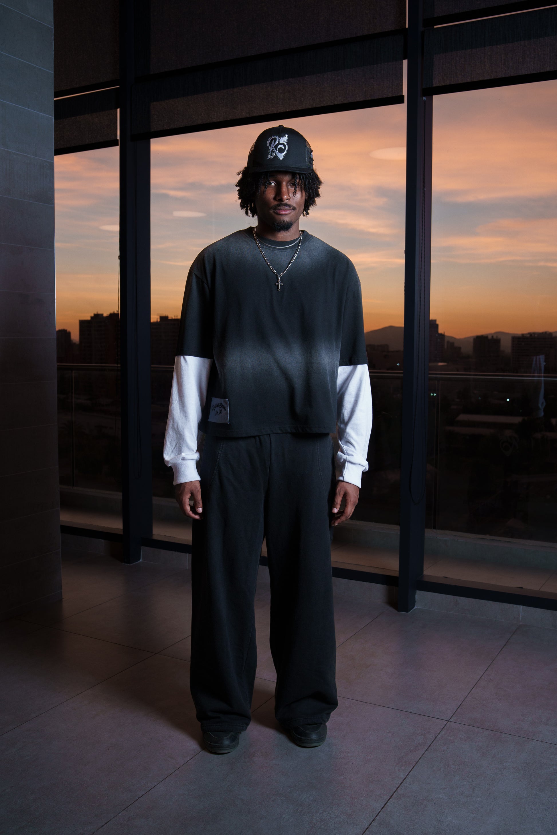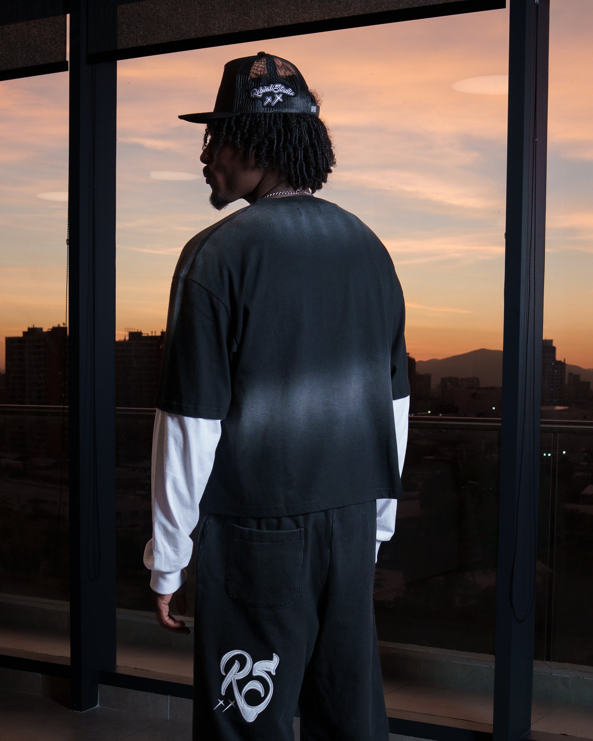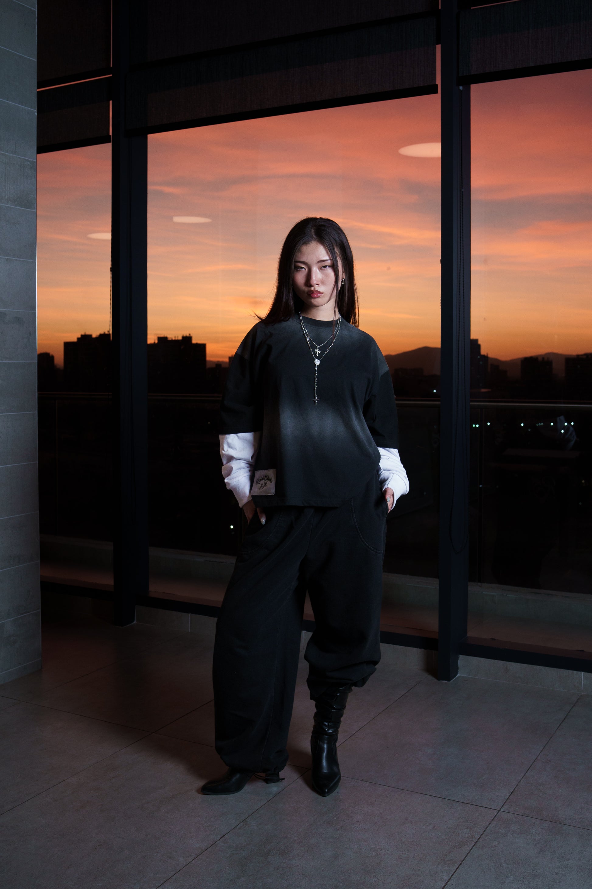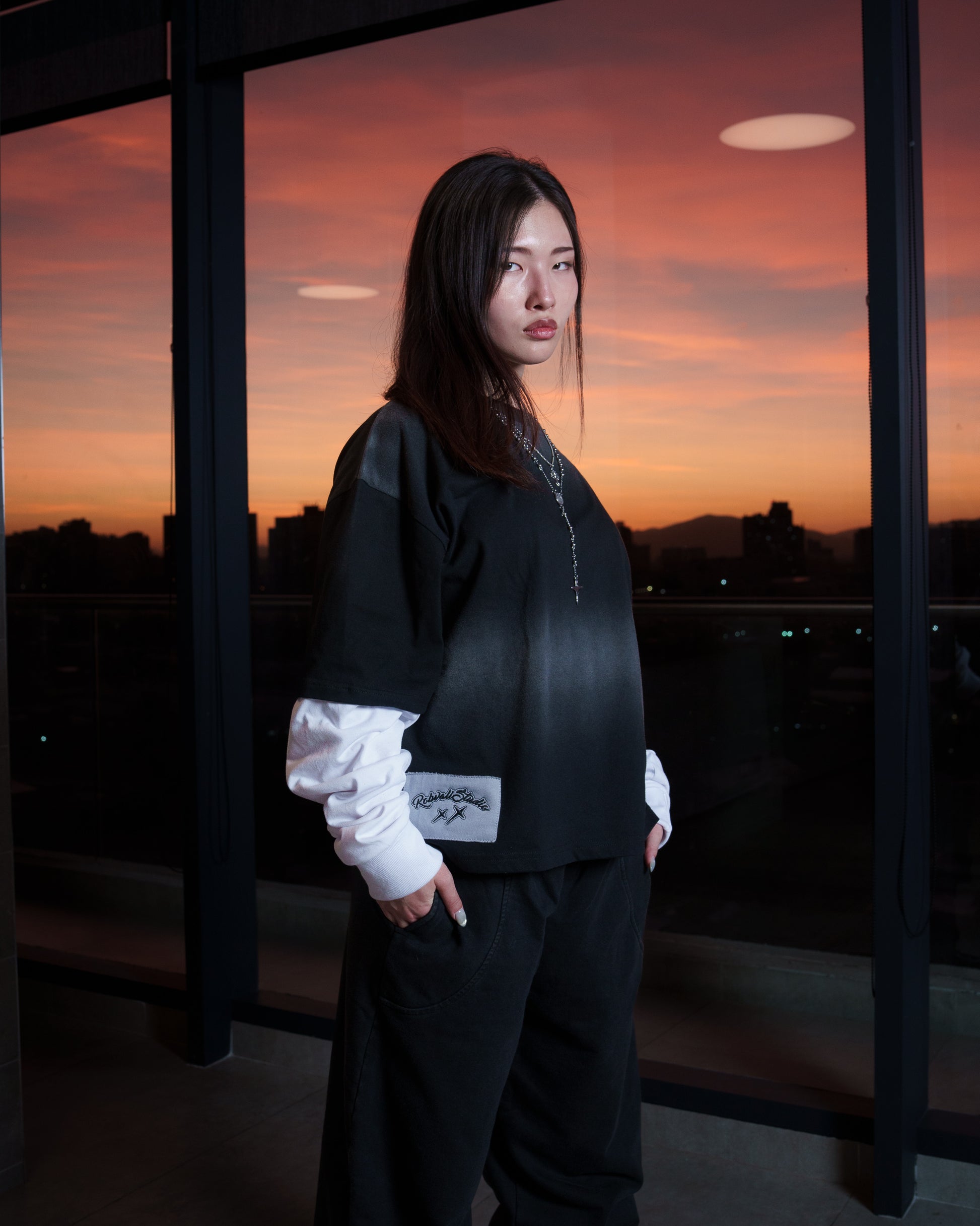La polera negra, de corte Boxy con un parche en la parte frontal inferior izquierda con un diseño discreto y presenta un efecto acid wash, dándole un estilo streetwear moderno.